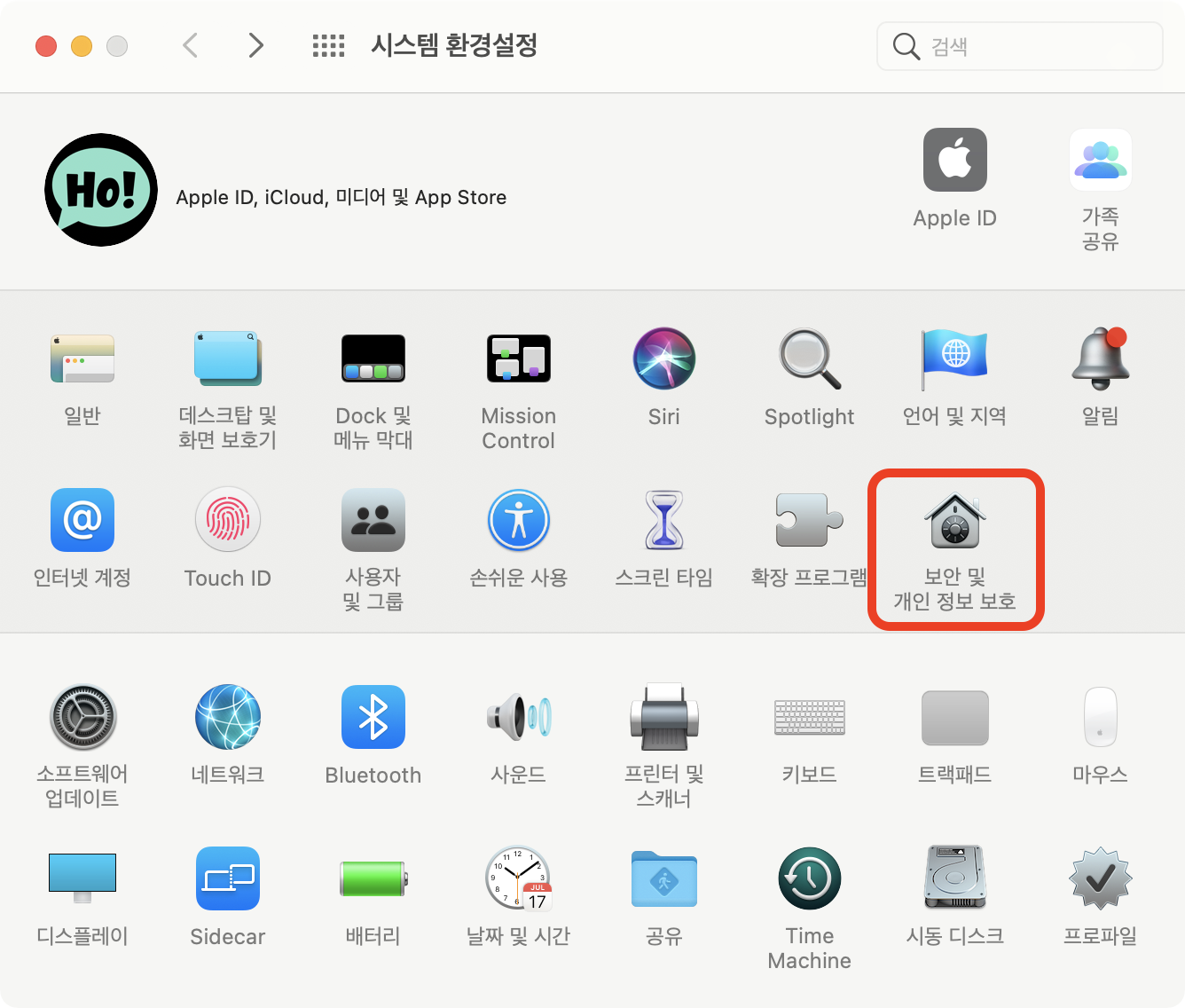 (1) '시스템 환경설정 > 보안 및 개인 정보 보호' 항목을 클릭합니다.
