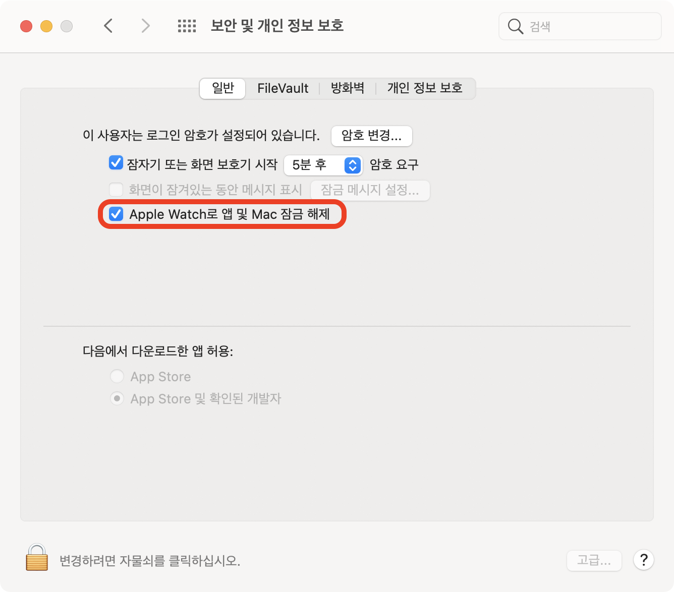 (2) 일반 탭의 메뉴 중 'Apple Watch로 앱 및 Mac 잠금 해제'를 체크해서 활성화시켜줍니다.