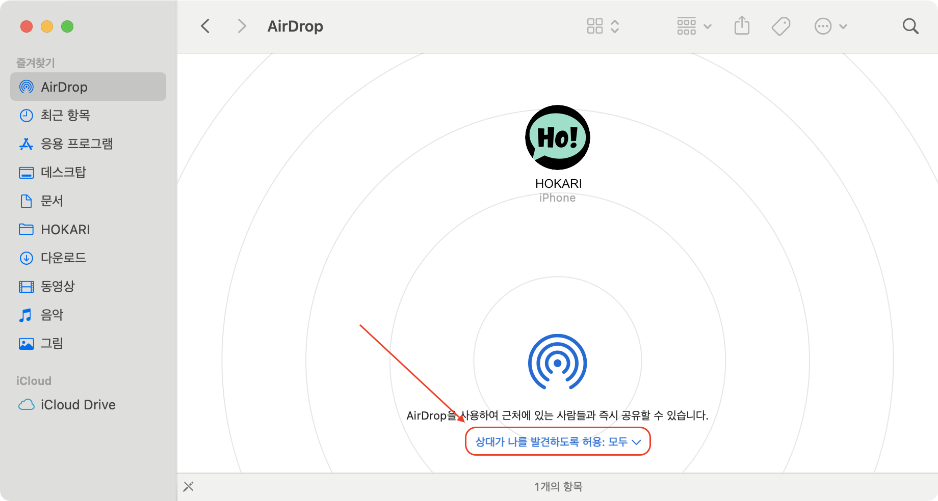 MacOS : Finder > AirDrop 에서 변경 가능 ('모두'로 변경)